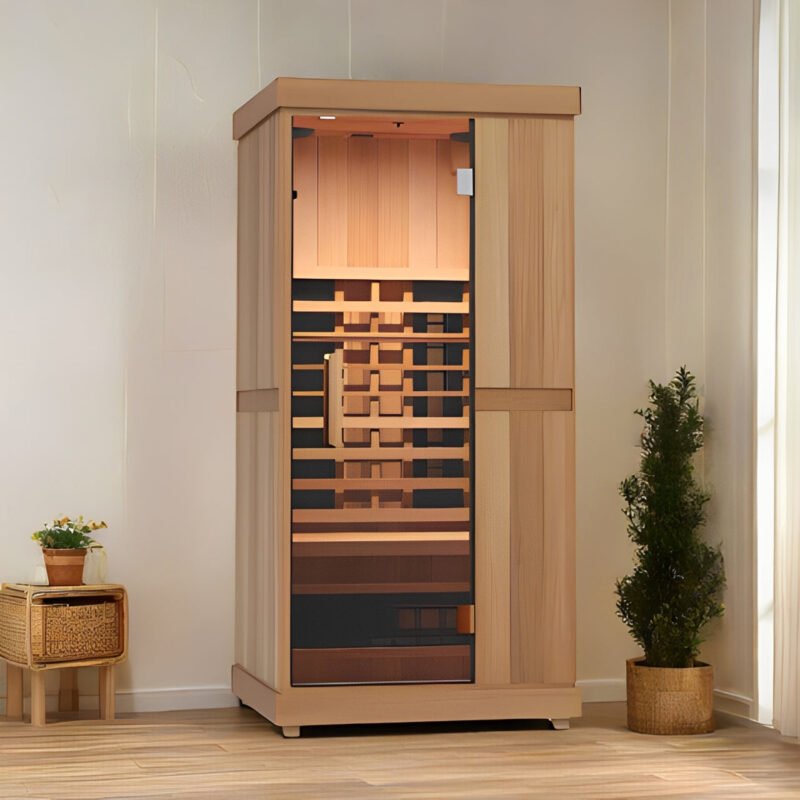 Imagine waking up every day feeling energized and refreshed with the Finnmark FD-1 Full-Spectrum 1 Person Infrared Sauna. This compact sauna seamlessly fits into your daily routine, offering unparalleled relaxation and health benefits. Constructed from antimicrobial Western Canadian cedar and a Thermal Plus™ Aspen exterior, the FD-1 combines durability with elegance. Its advanced full-spectrum infrared technology reaches temperatures up to 170°F, ensuring a deep, detoxifying sweat session. The sauna also features a built-in LCD touchscreen controller with Bluetooth audio, an ergonomic backrest, and removable feet for uneven surfaces, making it both user-friendly and highly effective.