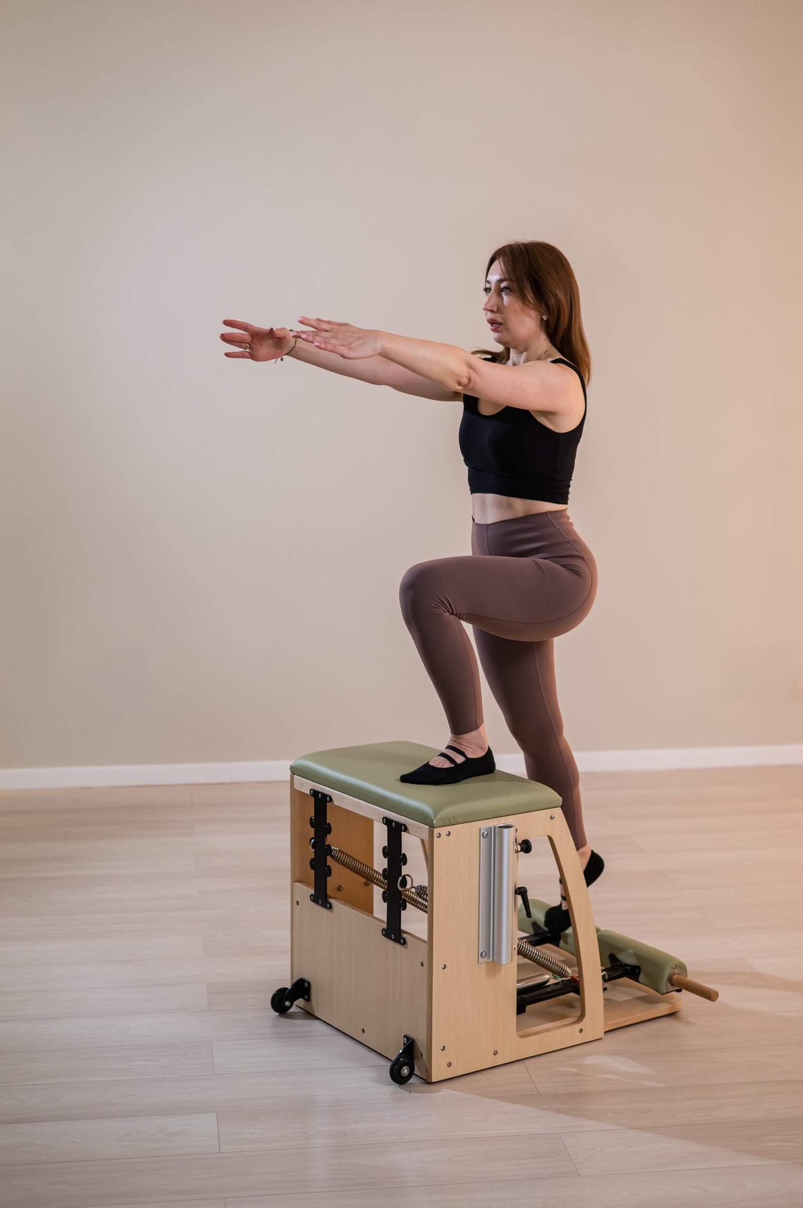 This chair supports a wide variety of Pilates movements, from seated core exercises to advanced standing work, like the swan or balance control steps. Its compact size allows for easy use in home studios and effortless integration with other equipment like the trapeze table.